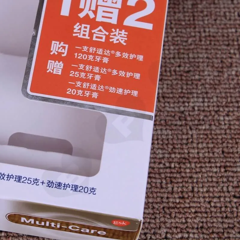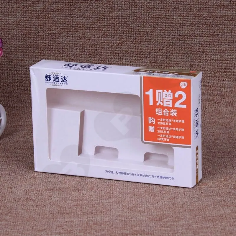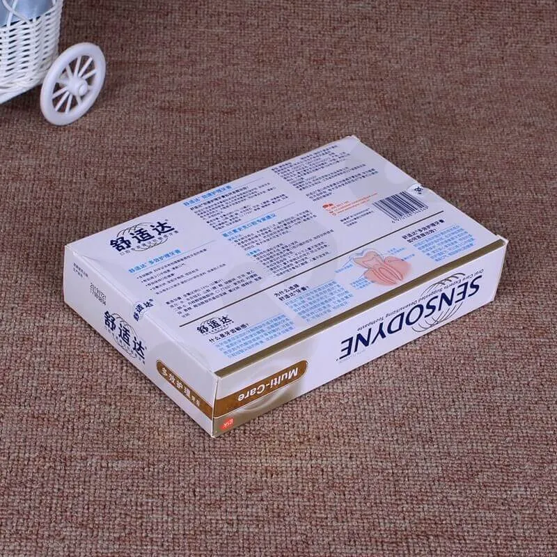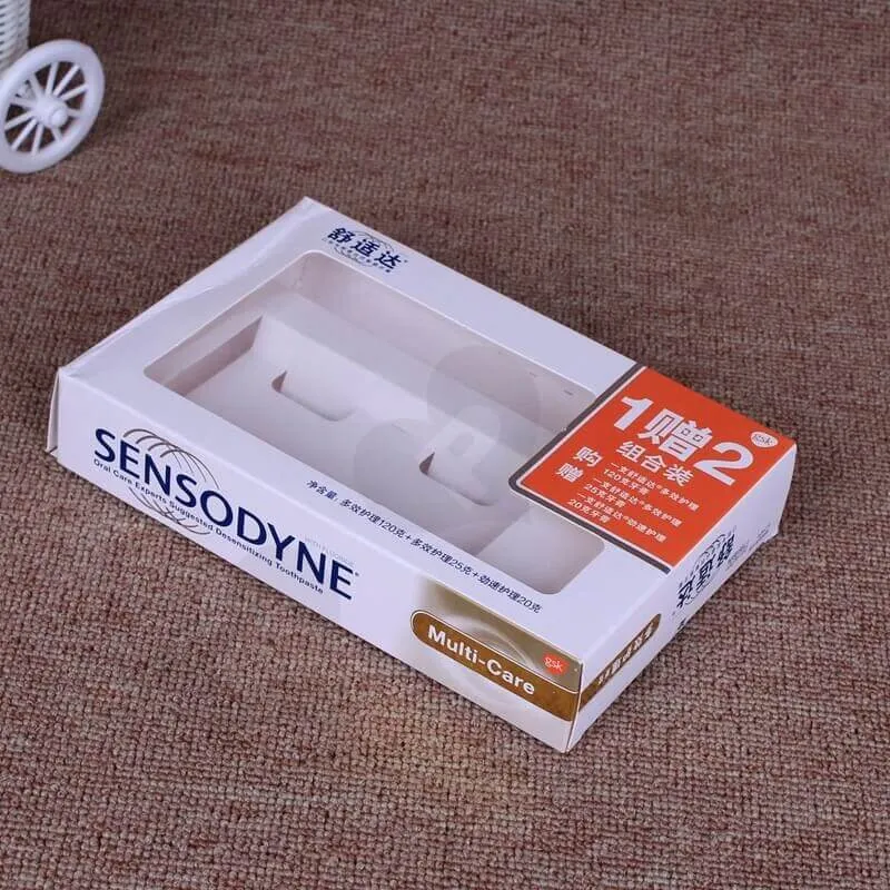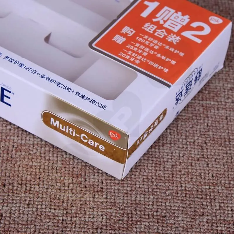 Caja de Cartón Blanco Impresa para Pasta Dental. Este es un estilo de caja con solapa plegable, el material utilizado es cartulina marfil de 300 g/m². Impresión offset CMYK con laminado brillante. El inserto es de cartón blanco. Nuestra cantidad mínima de pedido (MOQ) es de 500 unidades, y el tiempo de entrega es de siete días para la muestra y diez días para la producción.