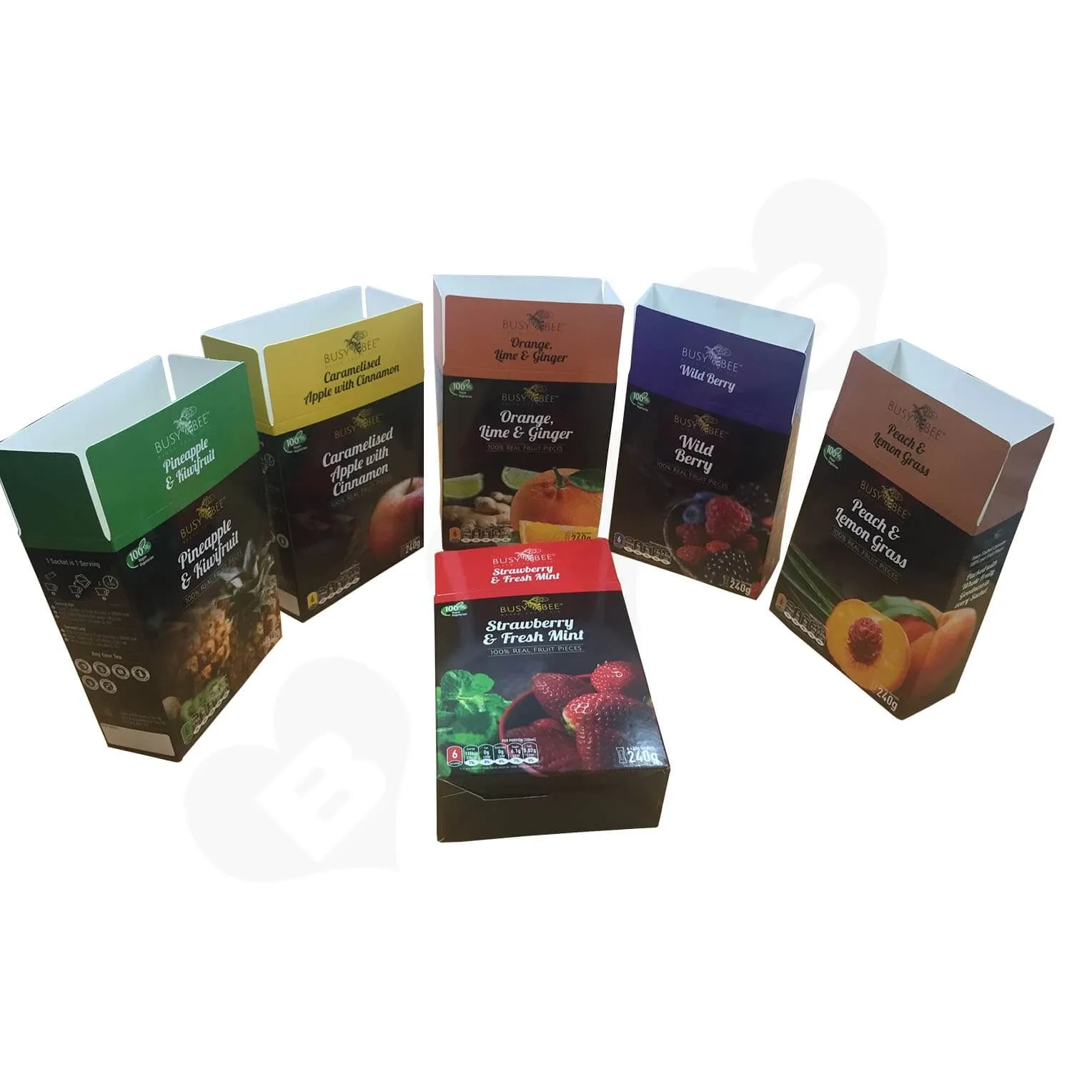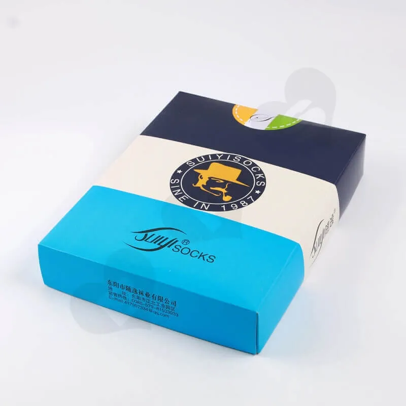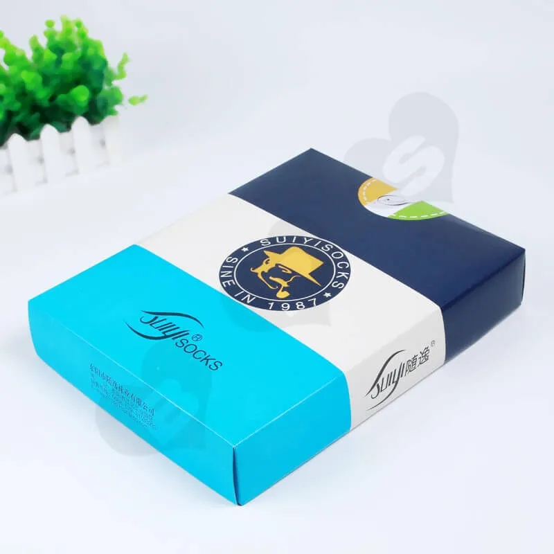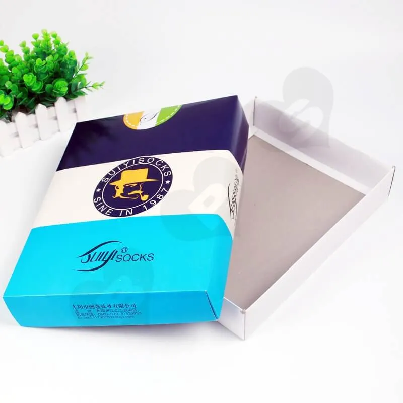 «Este es un estilo de caja de tapa e inferior personalizada con impresión para calcetines y ropa interior. Está fabricada con material de cartulina dúplex de 250 g/m² y presenta impresión offset CMYK con barniz. La cantidad mínima de pedido para este tipo de caja es de 500 unidades, con un tiempo de entrega de siete días para la muestra y diez días para la producción. La caja se puede enviar plana y se envuelve en papel kraft y película en los pallets para el envío.»