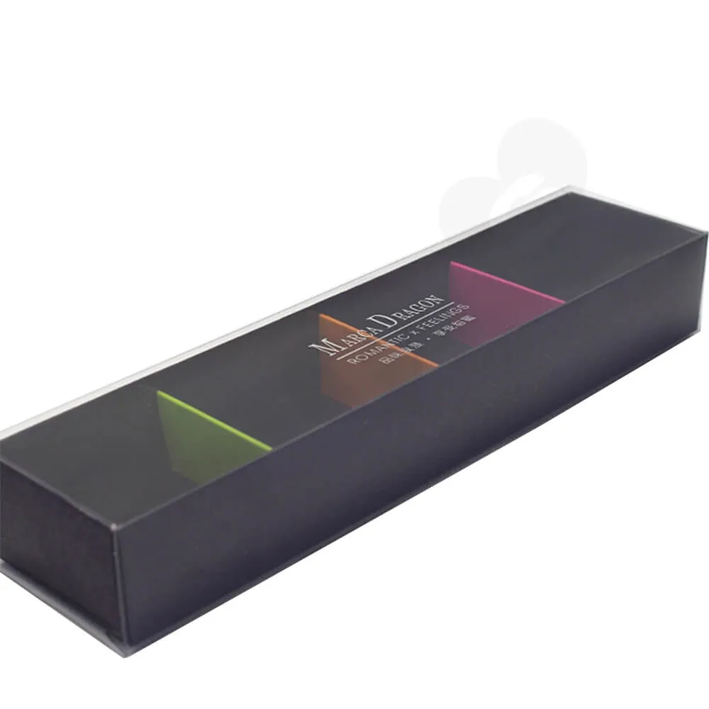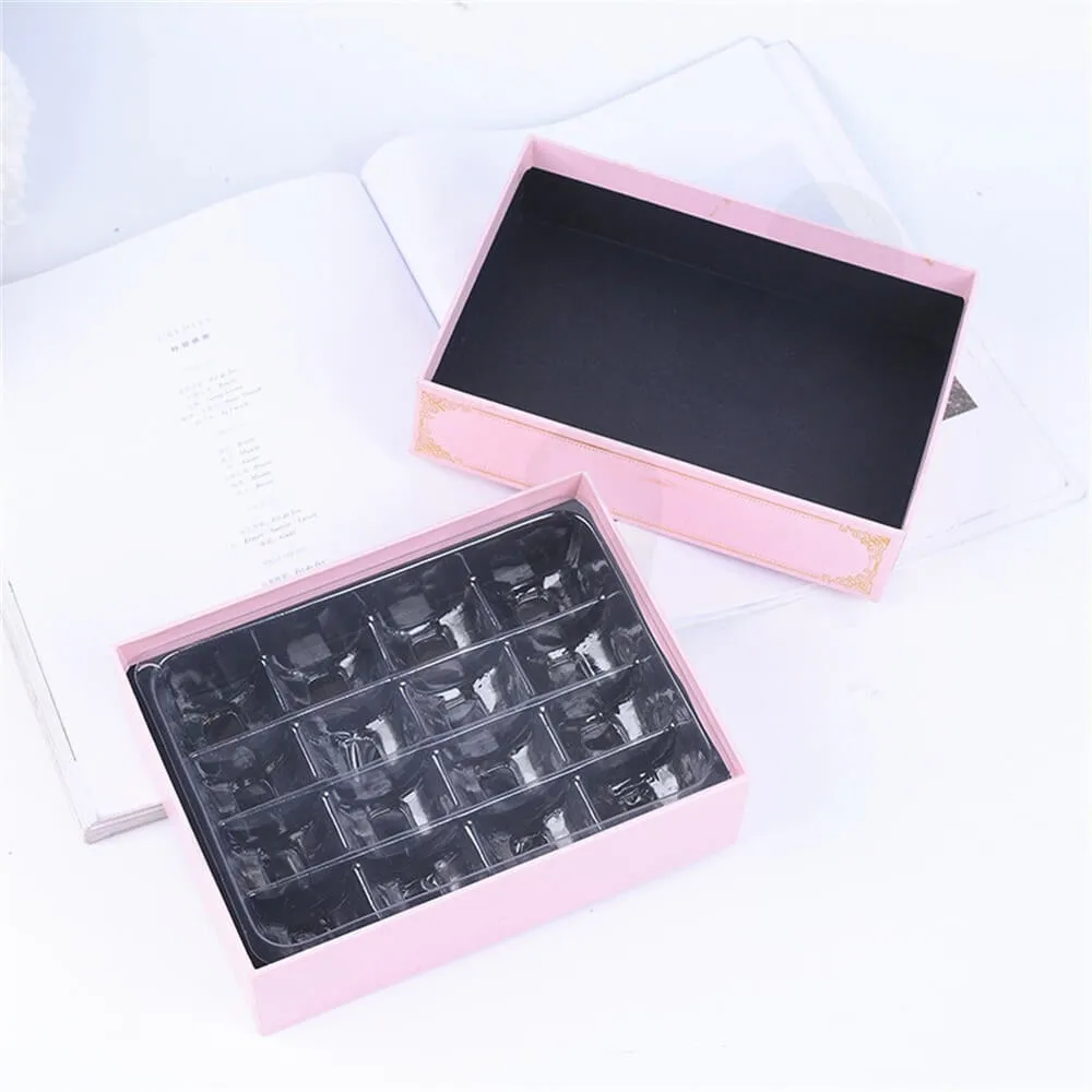 Las cajas son del tipo cajón estándar, con varios divisores. En el pasado, vendíamos cajas de siete colores: blanco, rosa claro, rosa intenso, negro, azul Tiffany, blanco y rojo. Podemos aplicar el estampado en caliente en la tapa de la caja, con el texto de su marca, no solo el nombre del producto.