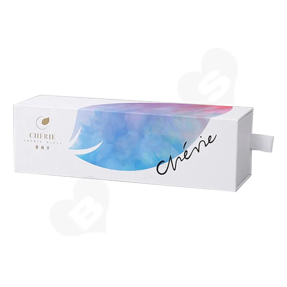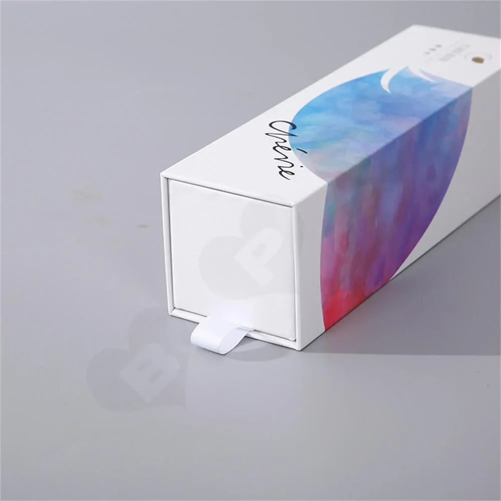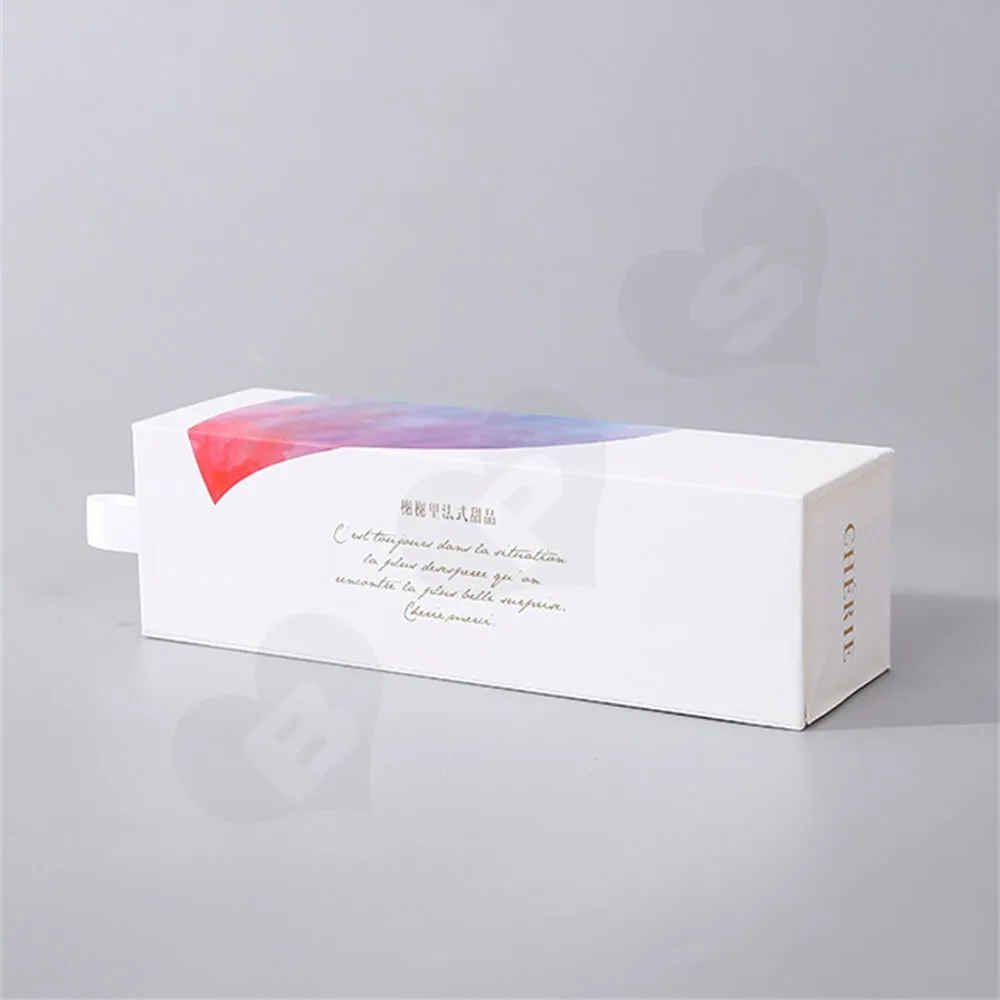 La caja de embalaje que se muestra en la imagen está hecha de material de cartón blanco de calidad alimentaria de 350 g/m², con un estilo de caja tipo cajón que los clientes pueden abrir fácilmente.