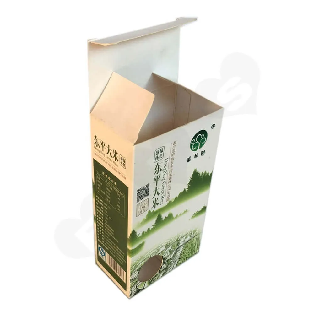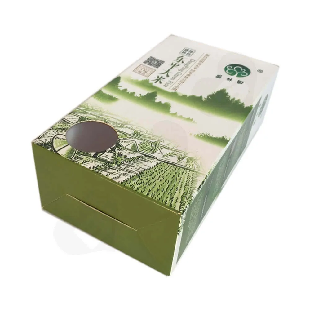Pour cette boîte d’emballage de riz avec patch de fenêtre, nous utilisons une impression en quadrichromie et couvrons le film sur la boîte, ce qui améliore l’attrait visuel de l’emballage. La boîte est conçue pour une ouverture et une fermeture faciles, ce qui facilite l’assemblage rapide des produits à base de riz par les fabricants. Pour assurer le transport en toute sécurité du colis, nous utilisons une boîte en carton ondulé à cinq couches pour l’emballage avant l’expédition.