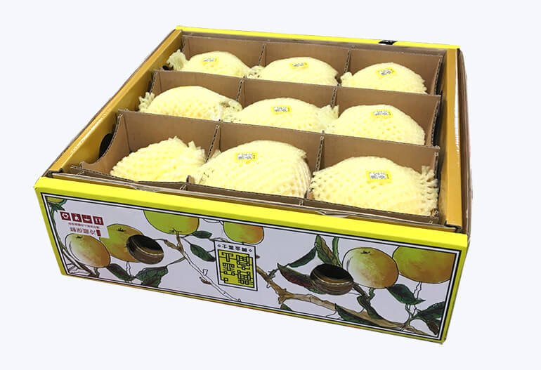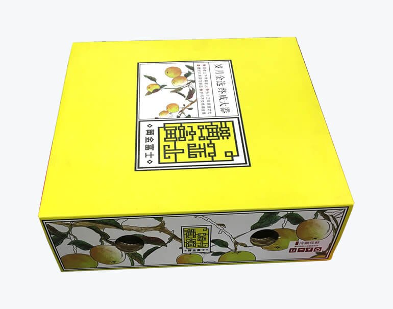 During transportation and storage, boxes can often become stuck together. Therefore, a lift-off lid box (consisting of a top and bottom box) is a suitable option. Additionally, since apples are delicate, it’s important to protect them from scratches caused by contact with each other. We recommend using pearl foam wrapping and cardboard inserts to keep them separated. This particular box is designed for nine-pack apples and is intended for use in supermarket retail sales.