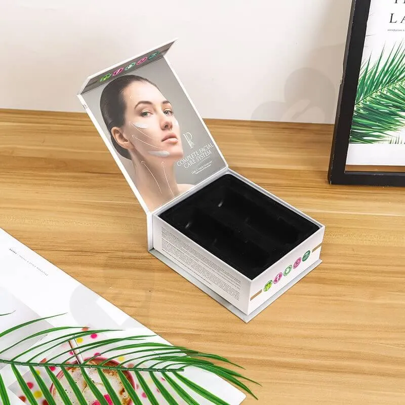 Bedrukte kartonnen doos voor compleet gezichtsverzorgingssysteem: Dit is een doos met magnetische sluiting, gemaakt van grijs karton met een dikte van 2 mm, gecoat met 157 g kunstpapier. Hij is voorzien van dubbelzijdig CMYK offsetdrukwerk met matte laminering en een aangepaste blisterverpakking met flockinzetstuk. De minimale bestelhoeveelheid voor deze doos is 500 stuks en de doorlooptijd is 7 dagen voor een monster en 10 dagen voor productie. De doos is verpakt in vijf lagen golfkarton.